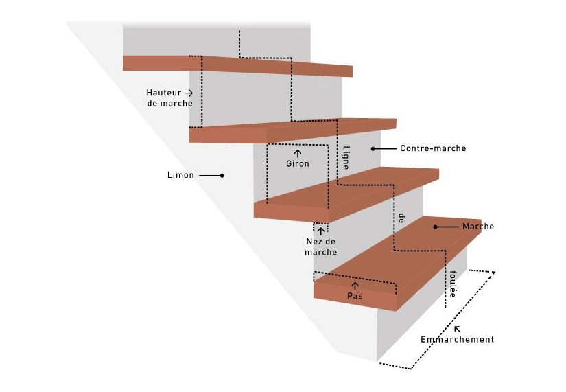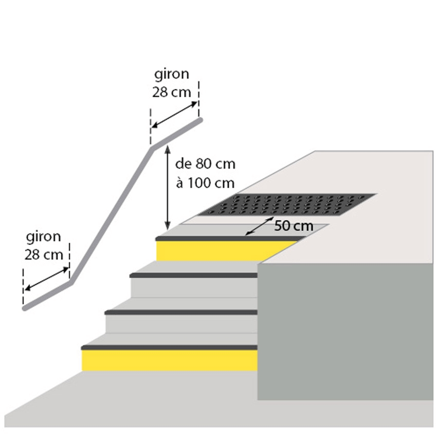 Normes PMR hauteur entre 80cm et 100cm, Partie droite en début et fin de palier 28cm, bande d’éveil à 50cm